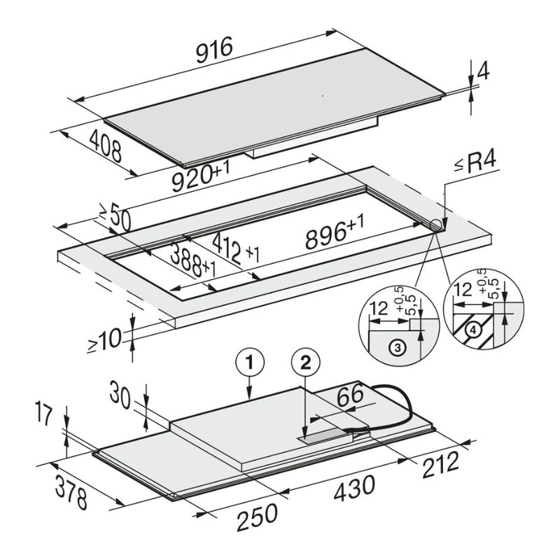 - Chiều rộng 916 mm để lắp đặt trên bề mặt hoặc lắp phẳng