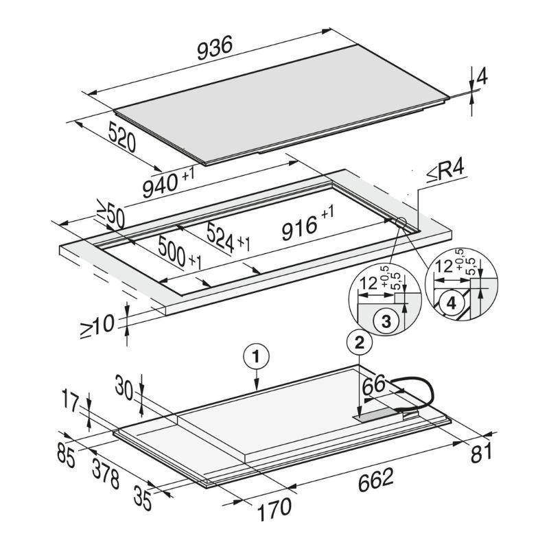 - Chiều rộng 936 mm để lắp đặt trên mặt phẳng hoặc trên mặt bàn