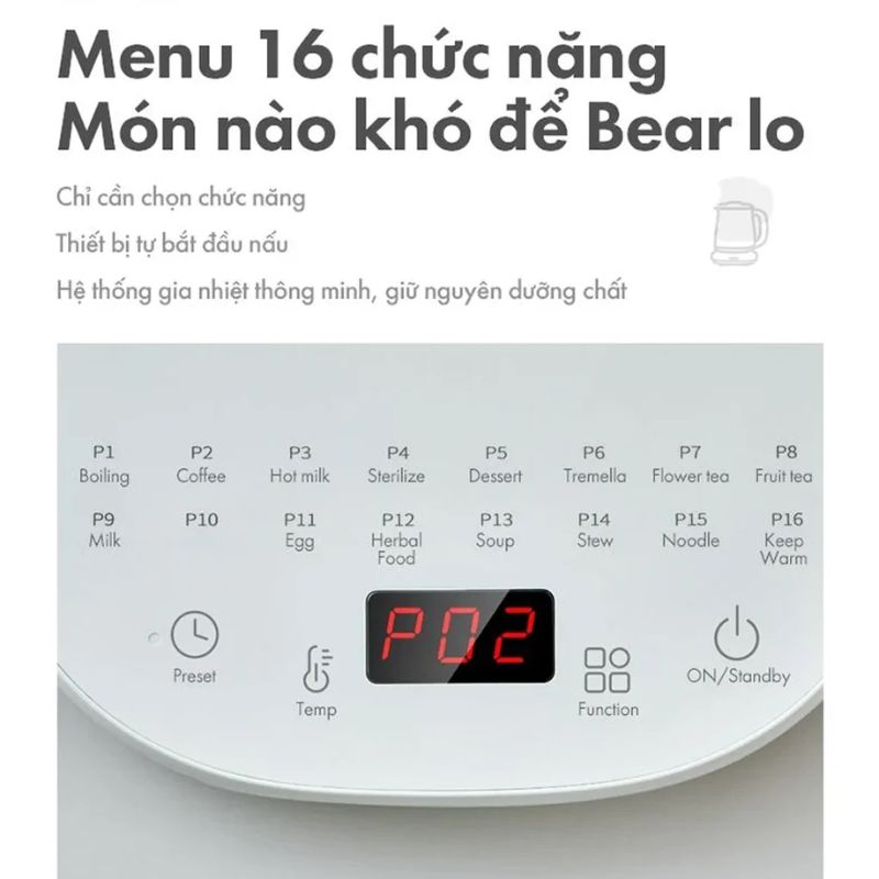 - Bình Đun Đa Năng Bear YSH-D15V7 1.5 Lít có thiết kế sang trọng và gam màu trắng tinh tế, sẽ là điểm nhấn ấn tượng cho không gian bếp của bạn. Với bình đun đa năng này, người dùng dễ dàng nấu được món đồ uống bổ sung dinh dưỡng mỗi ngày, cho tinh thần thêm thư thái và sảng khoái.