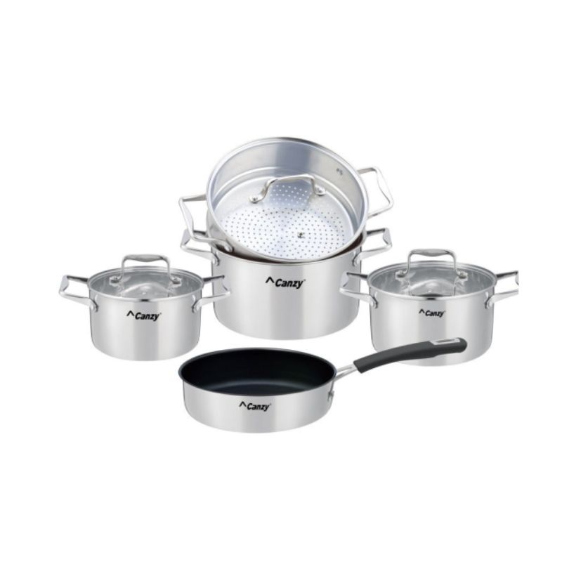 - Bộ xoong nồi cao cấp Canzy 5 món được làm từ Inox 201 sáng bóng, không phản ứng với thức ăn và an toàn cho sức khỏe