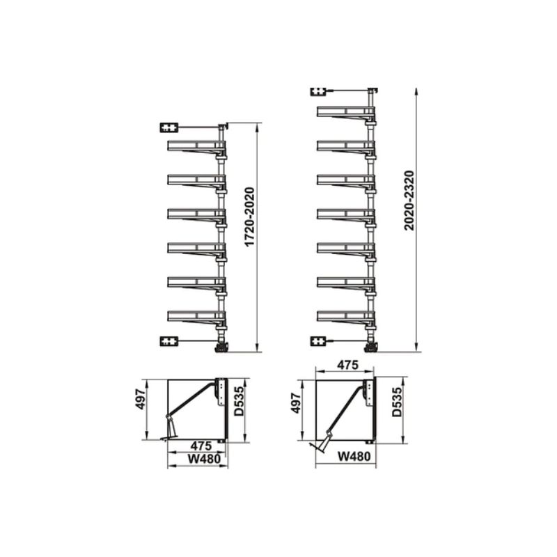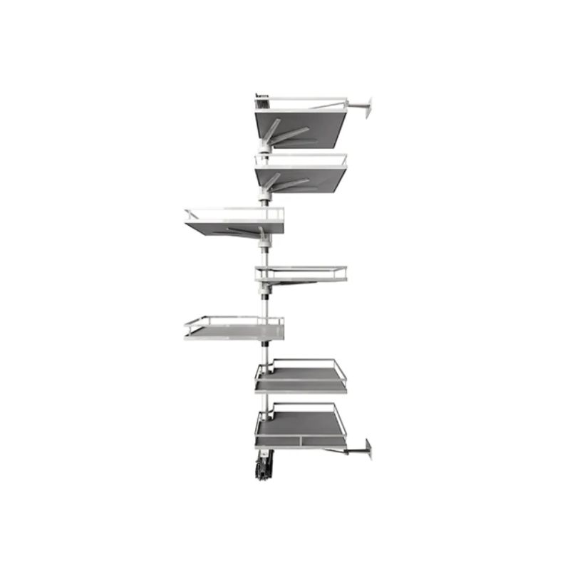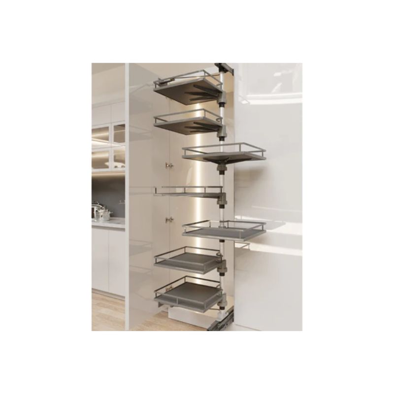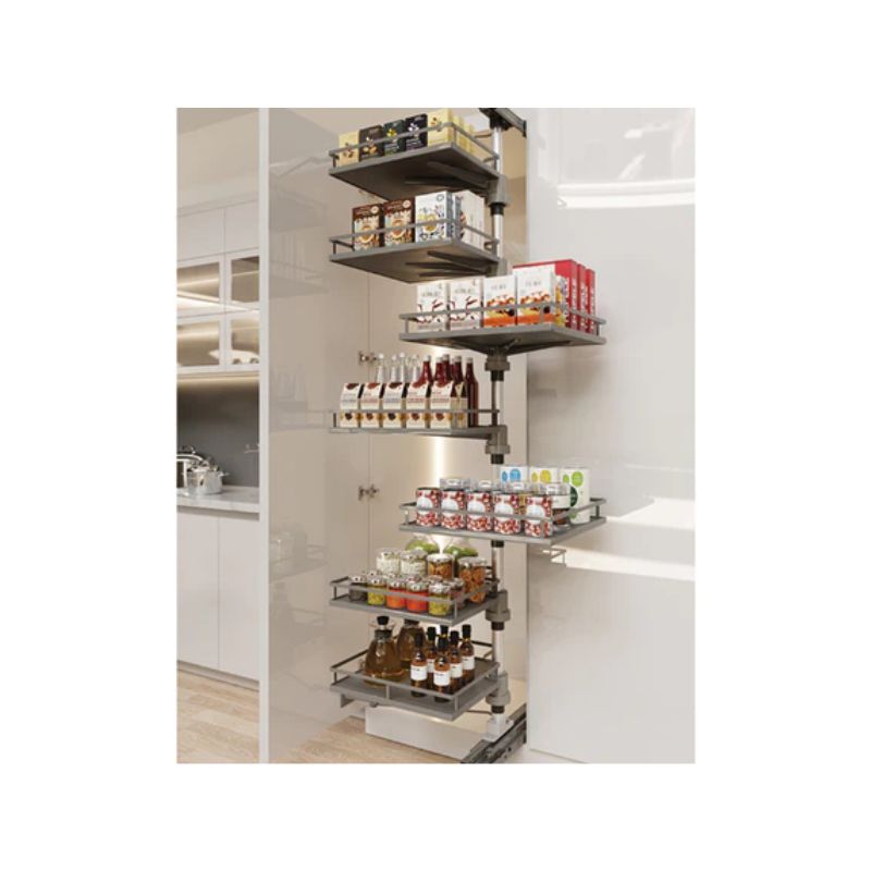 - Hệ thống rổ xoay di chuyển toàn bộ ra phía trước tủ để thuận tiện sắp xếp và lấy đồ dùng