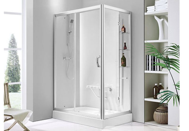 Bố trí nội thất bên trong: kệ khay, giá treo khăn tắm, ghế ngồi được phủ lớp chống ăn mòn, được lắp đặt bên trong phòng. Một lớp kính cường lực được thiết kế như một cánh cửa đóng mở bảo vệ các dụng cụ, đồ dung trên khay kệ.