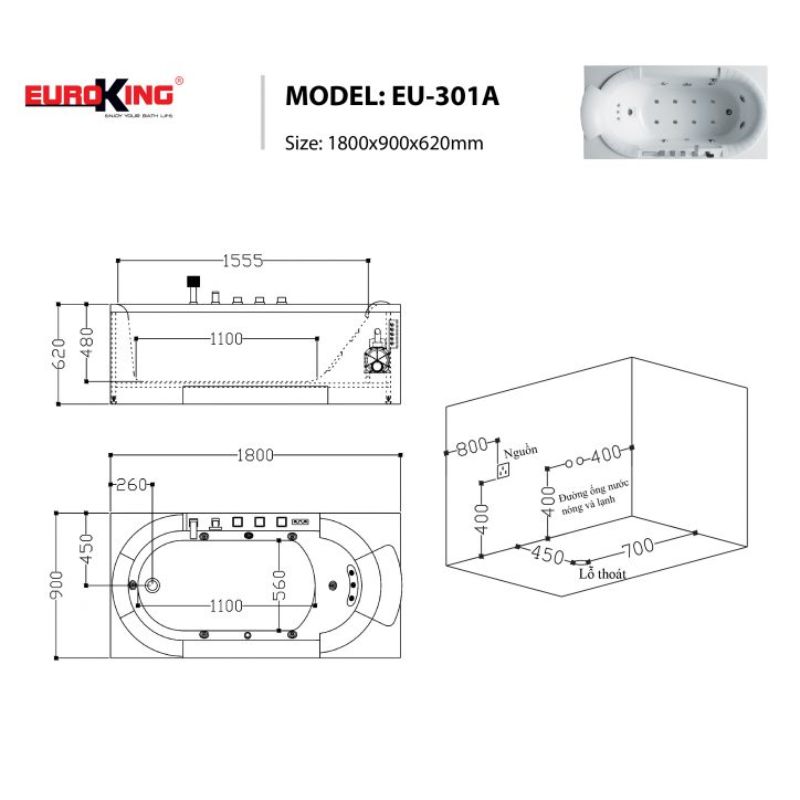 - Một lưu ý nhỏ là toàn bộ các tính năng trên của bồn tắm EU-301A sẽ không thể hoạt động nếu lượng nước không đủ theo khuyến cáo của nhà sản xuất. Do đó, chúng ta cần cấp đủ nước cho bồn tắm để có trải nghiệm thư giãn tốt nhất.