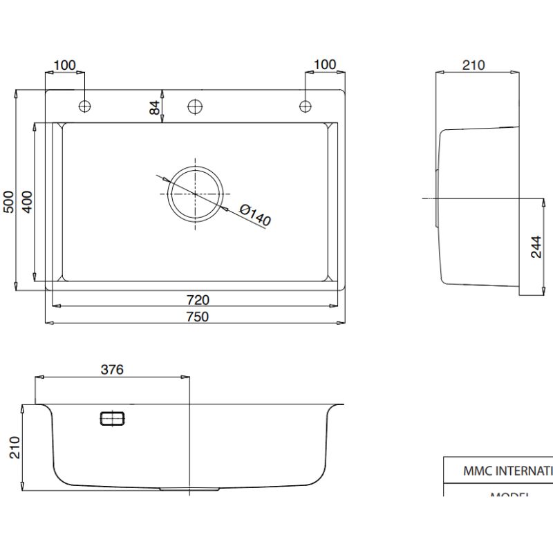 - Kích thước tổng thể chậu rửa bát (W x D x H): 750 x 500 x 210 mm