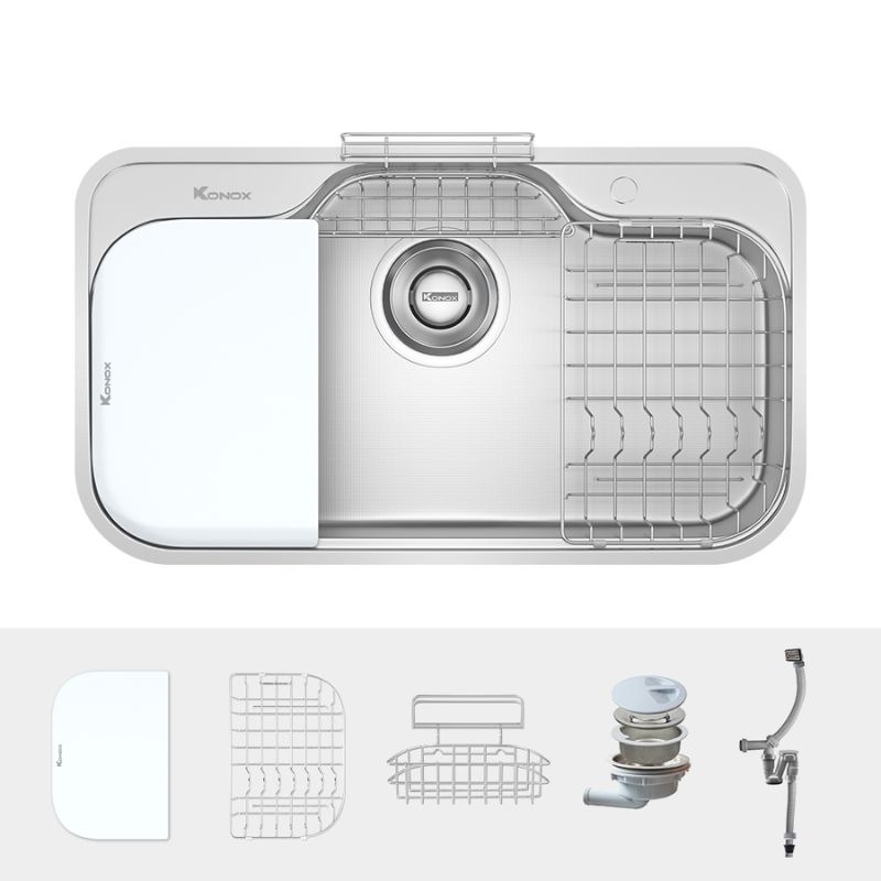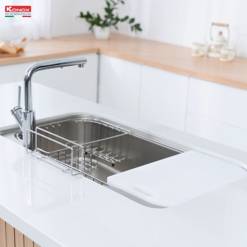 - Sản phẩm tích hợp cả phụ kiện thông minh nằm trên mặt chậu, bao gồm rổ phụ, giá úp bát inox và thớt nhựa, di chuyển linh động giúp việc sơ chế biến thực phẩm diễn ra suôn sẻ và nhanh chóng hơn. Đặc biệt, cấu tạo vòi rửa lệch phải + rổ phụ gắn cố định đối diện người dùng, thuận tiện cho mọi thao tác.