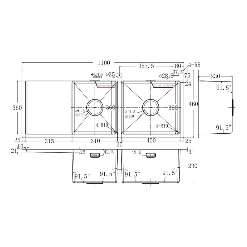 - Góc lượn R10 tinh tế, làm cho tổng thể chậu trở nên mềm mại hơn, cho phép lắp thêm vòi rửa và vòi lọc nước với trang bị 2 lỗ tròn được cắt sẵn.