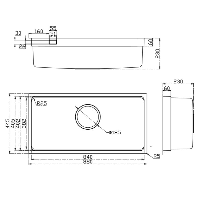Kích thước cắt đá (Under Mount) | W840 x D405 (mm) – 4 x R23 |