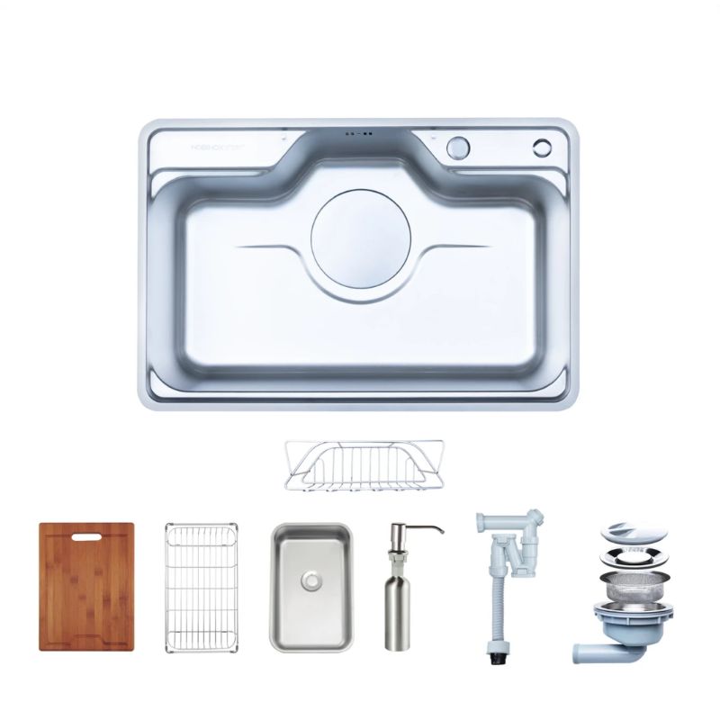 - Phụ kiện đi kèm đầy đủ: Bao gồm thớt tre, rổ inox, khay inox và bình đựng nước rửa bát, hỗ trợ tối đa cho quá trình sơ chế và vệ sinh hằng ngày.