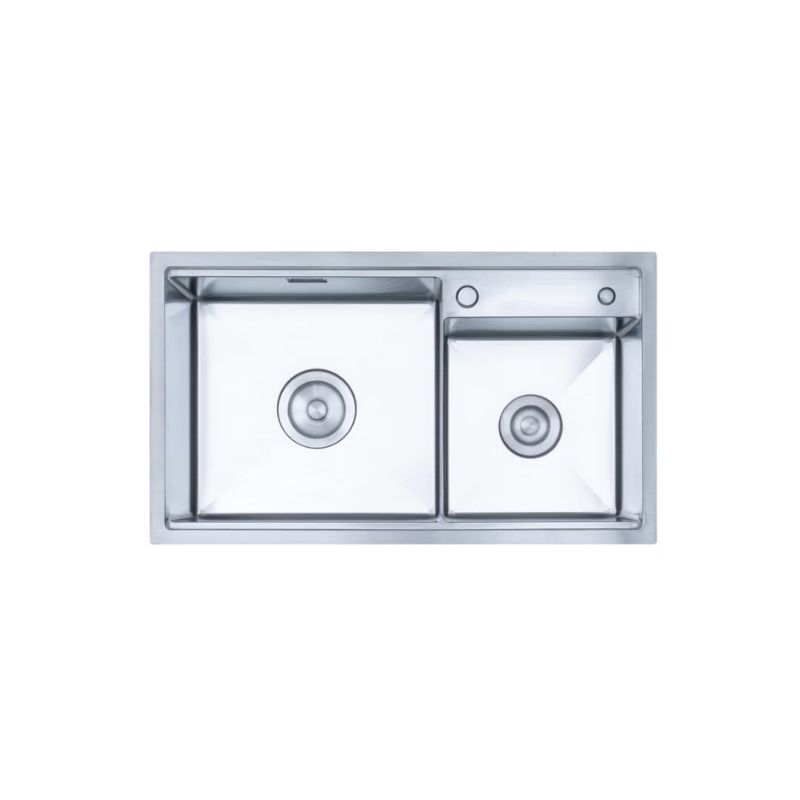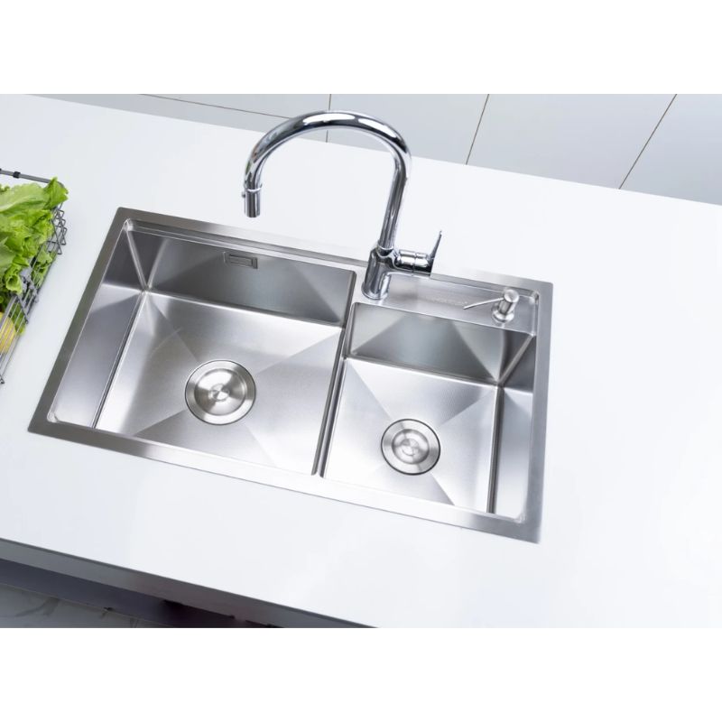 - Thiết kế 2 hố lệch mềm mại, hiện đại: Hai hố rửa bố trí không đối xứng kết hợp các đường cong tinh tế và góc bo tròn, vừa tăng tính thẩm mỹ vừa mang lại sự thuận tiện khi thao tác, dễ dàng hài hòa với nhiều phong cách nội thất bếp.