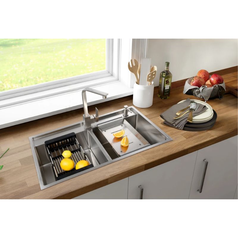 - Gờ hạ bậc tích hợp phụ kiện thông minh: Chậu đi kèm thớt, rổ và bình đựng nước rửa bát, hỗ trợ sắp xếp dụng cụ gọn gàng và tạo khu vực thao tác khoa học, thuận tiện hơn khi nấu nướng.