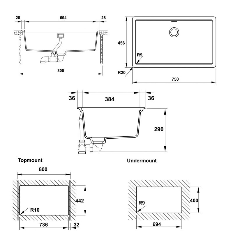– Kích thước cắt đá âm: 736D x 442Rmm