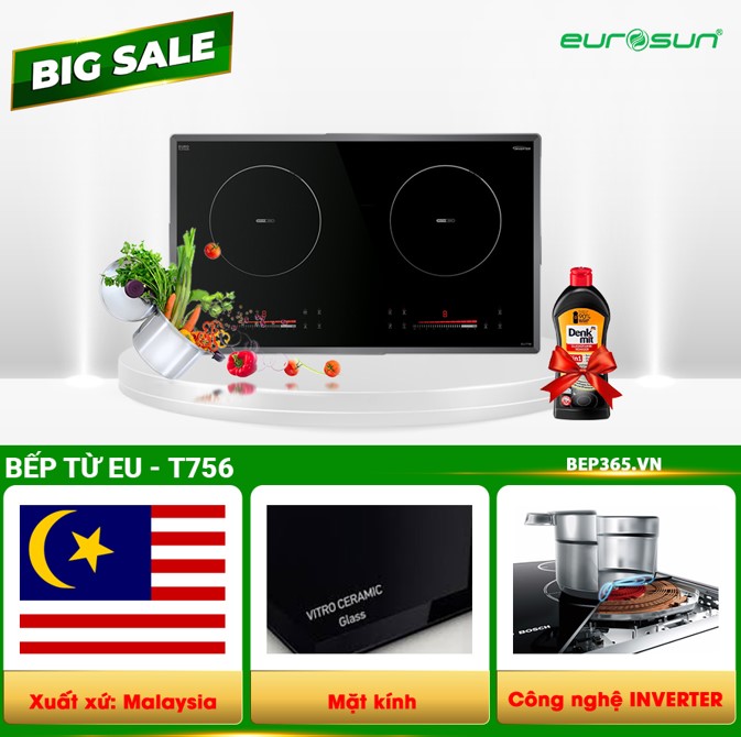 COMBO 8: Bếp từ đôi Eurosun EU-T756 + Máy hút mùi EUROSUN EH-70K11E + Chậu vòi rửa bát + Tặng bộ nồi