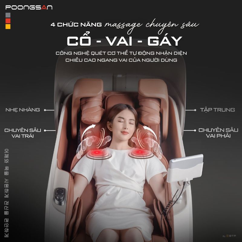 Công nghệ massage cổ vai 3D riêng biệt, massage chuyên sâu vai trái, phải, công nghệ hành trình I-Open thế hệ mới mở rộng góc 168 độ, độ dịch chuyển lên đến 10,7cm và mở rộng 2 bên 5-21,5 cm |