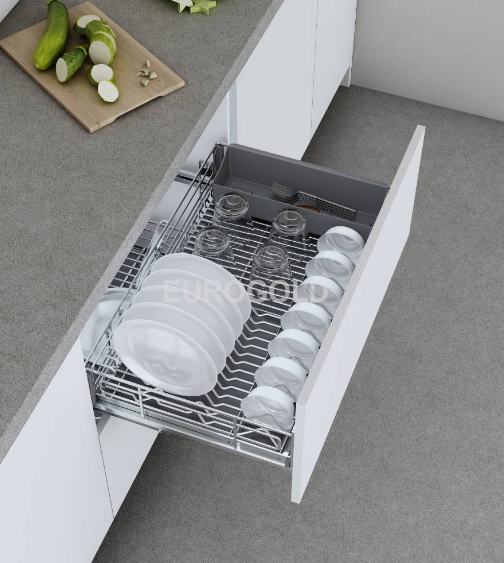 - Giá được thiết kế âm tủ gọn gàng và tiện dụng, tích hợp 4 trong 1: ngoài để xoong nồi, giá còn để được bát, đĩa và đũa thìa.