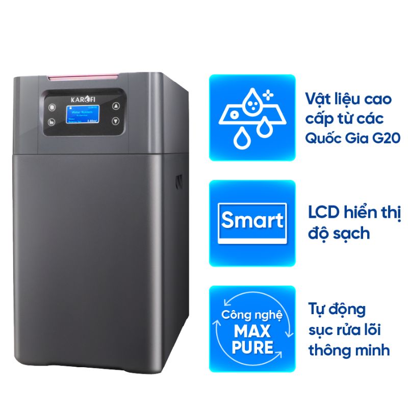 - Cột lọc MAX CLEAN than hoạt tính: Được nghiên cứu và thiết kế độc quyền dựa trên đặc tính nguồn nước Việt Nam, hệ thống sử dụng vật liệu than hoạt tính cao cấp nhập khẩu từ các quốc gia trong khối G20, đảm bảo hiệu quả loại bỏ hợp chất hữu cơ, clo dư, mùi hôi trong nước.