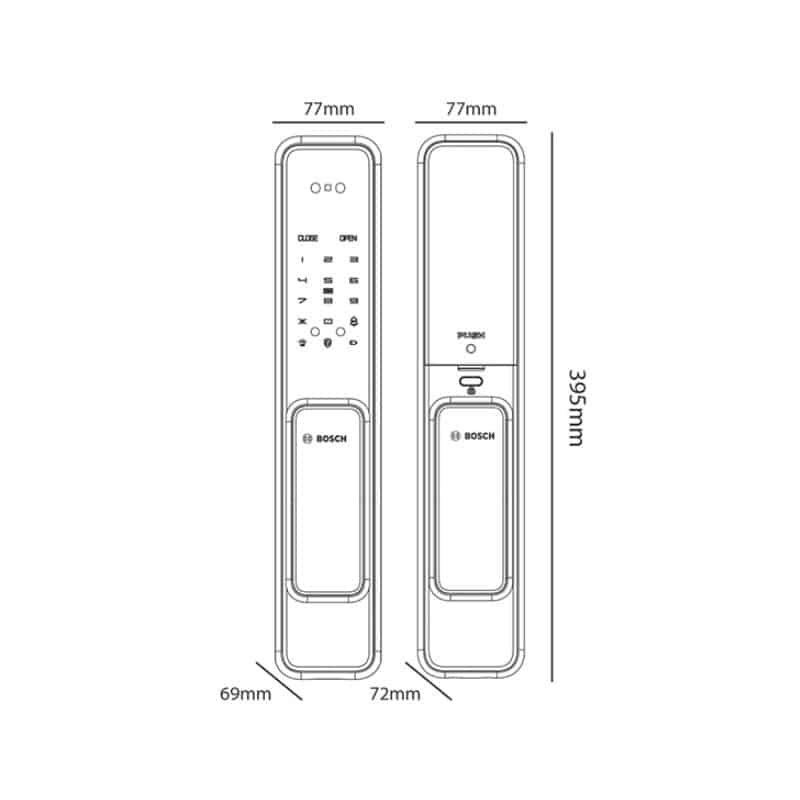 - Kích thước thân khóa ngoài (R x C x D): 75 x 396 x 69 mm
