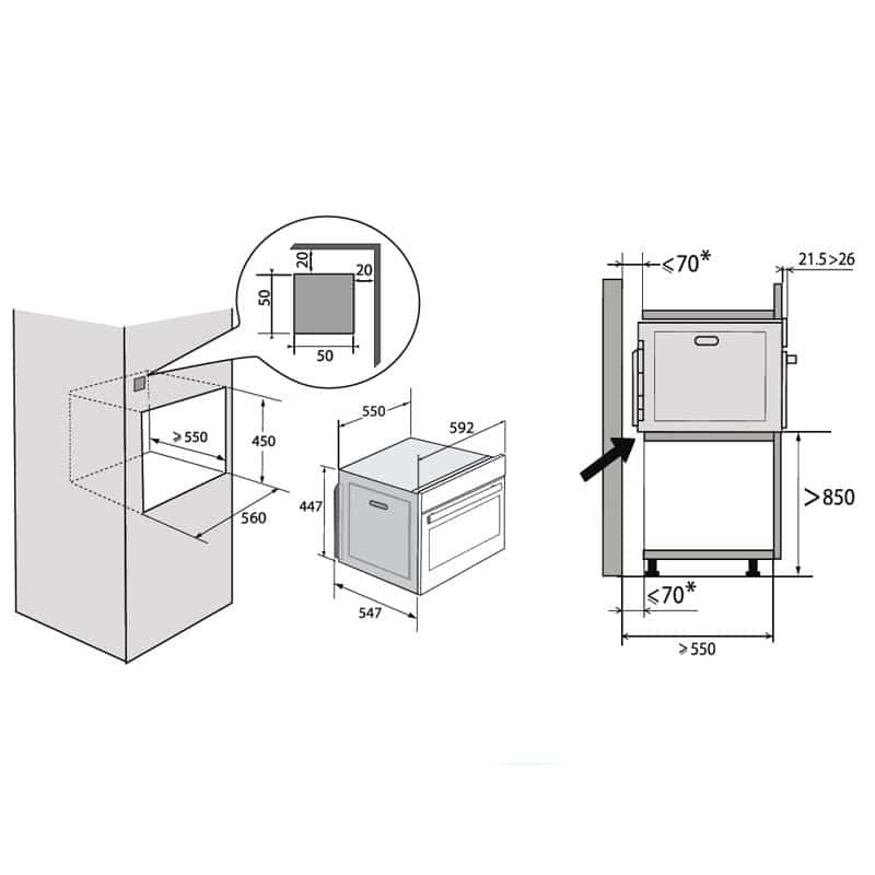 - Kích thước lắp đặt (Cao x Rộng x Sâu): 450 x 560 x 550 mm