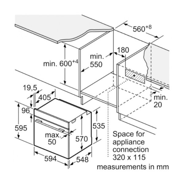- Kích thước lắp đặt (Cao x Rộng x Sâu): 585 mm – 595 mm x 560 mm – 568 mm x 550 mm