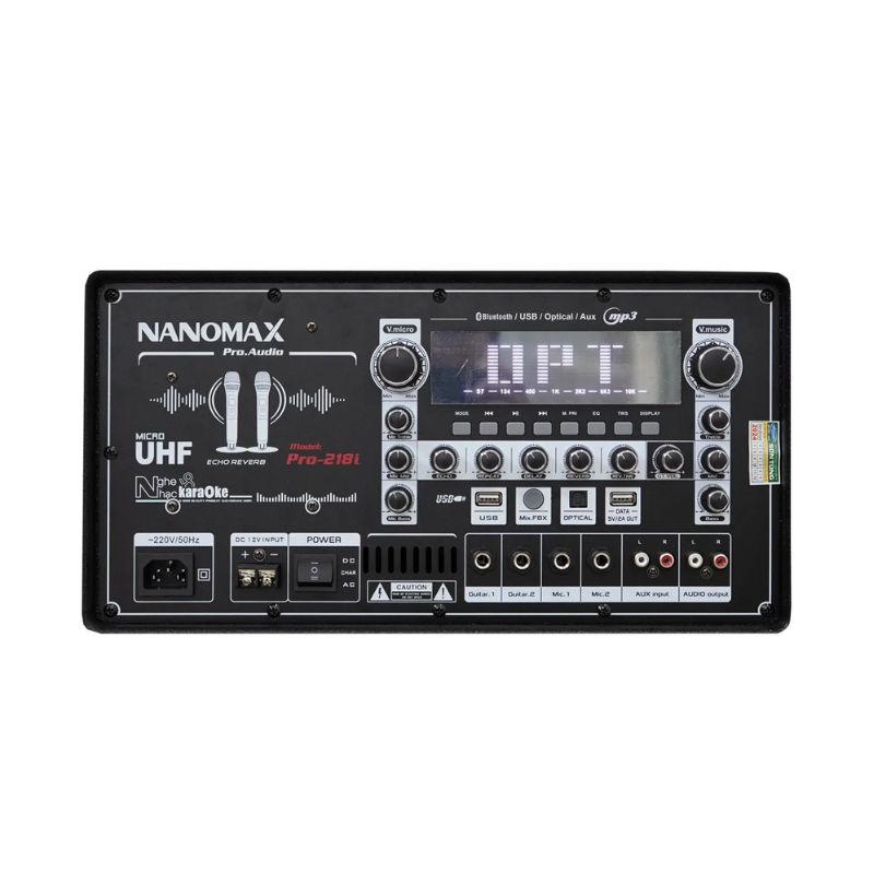 - Kết nối linh hoạt, hiện đại với nhiều phương thức: Loa được trang bị chuẩn Bluetooth 6.2 với tầm phủ sóng xa trên 30m, cho phép kết nối không dây ổn định và nhanh chóng với các thiết bị như điện thoại, laptop hay máy tính bảng. Ngoài ra, siêu phẩm Nanomax PRO-218i còn hỗ trợ các kết nối quang học (Optical), cổng USB, thẻ nhớ SD, jack RCA cho tín hiệu Audio (in-out), jack 6 li để kết nối micro có dây và guitar điện, mang lại sự tiện dụng cho khách hàng trong mọi trường hợp cần phối ghép các thiết bị điện tử.