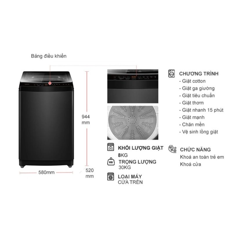 - Khối lượng giặt 8kg phù hợp với nhu cầu sử dụng của gia đình 3 – 5 người.