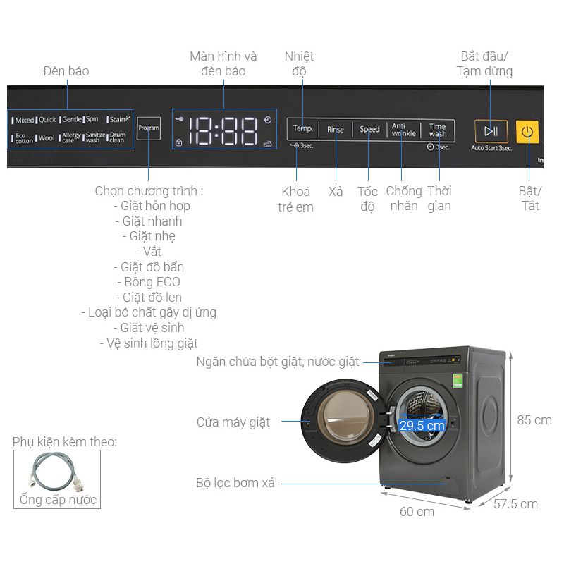 Tính năng khác | Chống nhăn Khóa trẻ em Khử trùng lồng giặt ở 90°C Thêm đồ trong khi giặt Tự khởi động lại khi có điện |