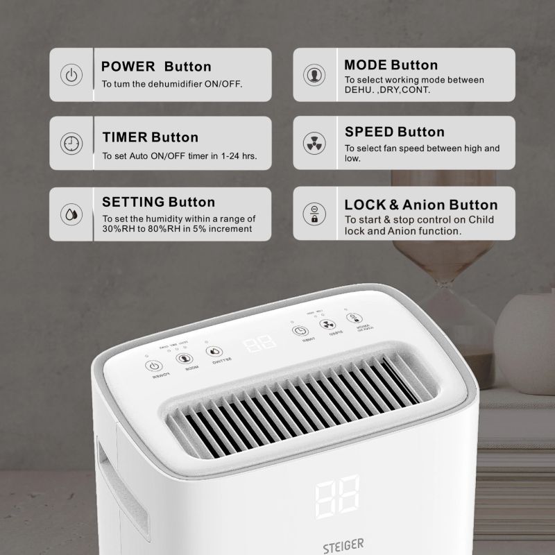 - Máy hút ẩm Steiger STG – 836DW thiết kế hiện đại và gần gũi với người dùng: Tiện lợi trong cuộc sống của bạn – Màn hình LED phía trước hiển thị độ ẩm theo thời gian thực, cho phép bạn kiểm soát độ ẩm bất cứ lúc nào. Máy hút ẩm tự động dừng khi đạt đến mức độ ẩm được cài đặt trước. Ngoài ra, nó có tính năng khởi động lại thông minh sau khi khôi phục mất điện và bộ nhớ khôi phục cài đặt. Giúp bạn không còn lo lắng về việc mất điện để dừng công việc. Steiger STG – 836DW được trang bị bánh xe 360° và tay cầm lõm giúp dễ dàng di chuyển, đáp ứng nhu cầu hút ẩm của nhiều không gian khác nhau. Ngăn lưu trữ dây nguồn có thể giúp dây cáp gọn gàng và an toàn. Các tính năng này kết hợp lại mang đến trải nghiệm sử dụng thân thiện với người dùng và hiệu quả.