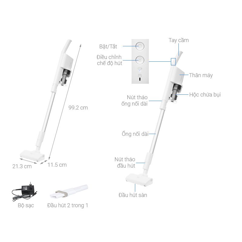 - Công suất hút 80W lấy đi bụi bẩn nhanh chóng Sản phẩm có công suất hoạt động là 230W, công suất hút là 80W giúp lấy đi bụi bẩn nhanh chóng. Máy hút bụi trên nhiều bề mặt như sàn nhà, bàn, ghế, tủ, kệ, thảm, các gầm, góc, khe một cách rất hiệu quả.