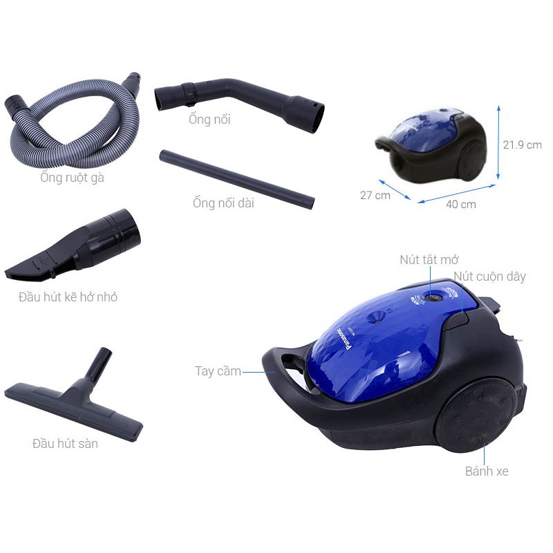 - Đầu hút linh hoạt làm sạch mọi vị trí Máy Hút Bụi Panasonic MC-CG371AN46 sở hữu hai phụ kiện đi kèm là đầu hút khe và đầu hút thảm, giúp thiết bị có thể làm sạch ở bất kỳ vị trí nào dù là sàn cứng hay mềm, gầm giường hay vị trí khó tiếp cận. Bạn có thể linh hoạt thay đổi đầu hút cho thiết bị của mình để hiệu quả dọn dẹp trở nên tối ưu hơn.