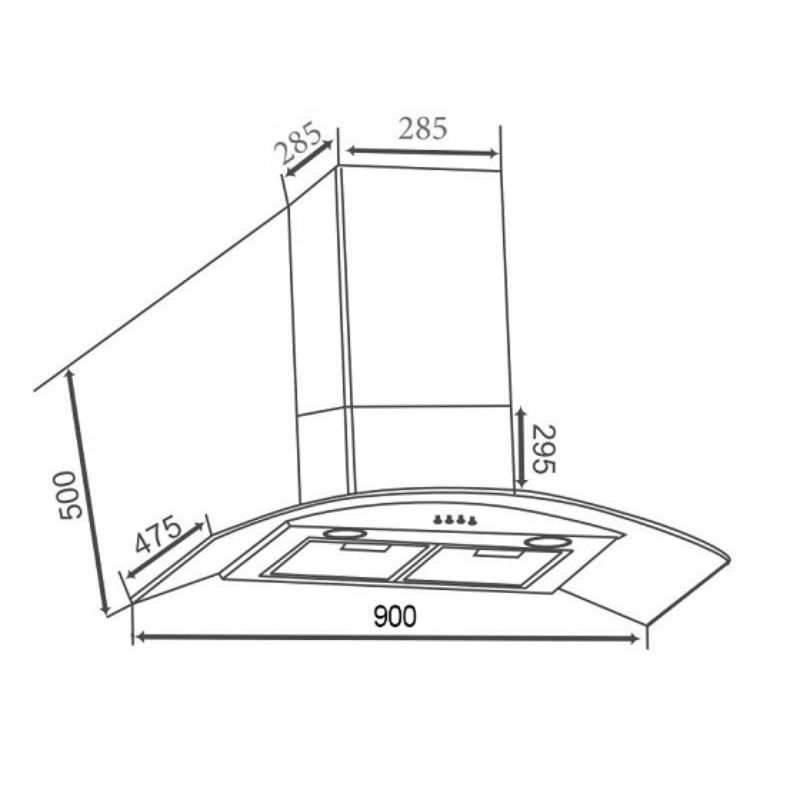 - Chiều ngang máy 900 mm phù hợp cả các gian bếp lớn, có tần suất và cường độ nấu nướng liên tục với bố trí 3, 4 vùng nấu bật cùng lúc. Kiểu máy toa kính cong gắn tường đặc trưng tăng cường hiệu quả hút khói, khử mùi.