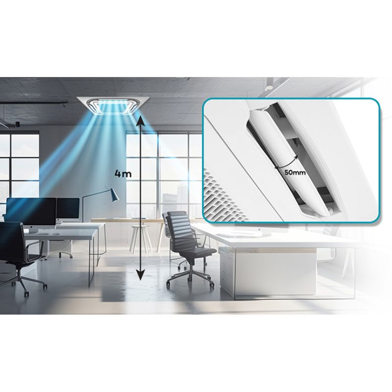 - Luồng khí mạnh mẽ: Máy lạnh được thiết kế với luồng khí mạnh mẽ, có khả năng vươn xa để bao phủ toàn bộ không gian phòng rộng lớn. Với cánh dẫn khí lớn rộng 50mm, sản phẩm cung cấp một luồng khí mạnh và mát mẻ, giúp nhanh chóng làm giảm nhiệt độ và tạo cảm giác thoải mái cho người dùng. Chiều cao cấp khí tăng 10% lên đến 4m, giúp phân phối không khí đều đặn trong không gian, đồng thời tối ưu hóa hiệu suất làm lạnh của máy.
