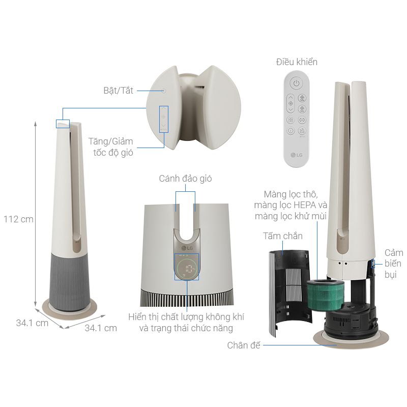 - Thiết kế: Máy lọc không khí LG PuriCare AeroTower màu be trang nhã, thiết kế tối ưu và hướng đến người dùng với kiểu thiết kế nghệ thuật Aerodynamic – lấy cảm hứng từ thung lũng, tạo ra làn gió tự nhiên với vẻ ngoài tinh tế và hiện đại mang đến cho ngôi nhà một nét riêng, thích hợp với nhiều không gian: phòng khách, phòng ngủ,… Lọc sạch không khí và làm mát hiệu quả với không gian dưới 23.2m².
