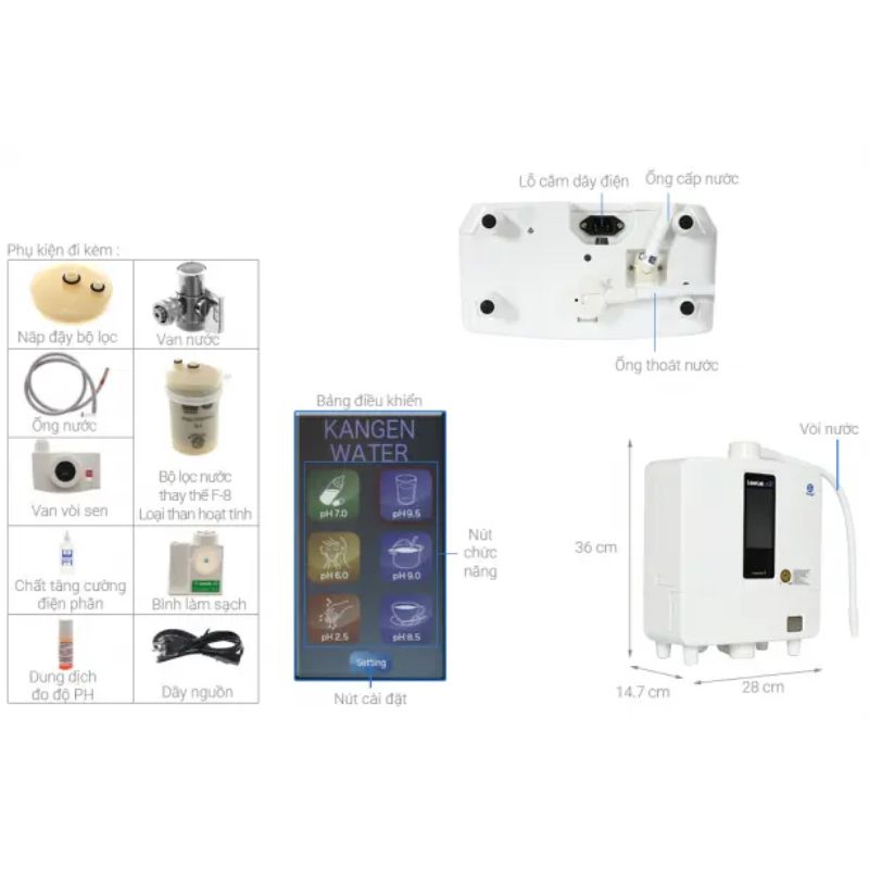 - Kiểu dáng để bàn nhỏ gọn: Kangen LeveLuk K8 là dòng máy lọc nước điện giải ion kiềm của tập đoàn Enagic (Nhật Bản). Máy có thiết kế nhỏ gọn, kiểu dáng để bàn tiện dụng. Sản phẩm có kích thước 28 x 36 x 14.7cm (Ngang x Cao x Sâu). Máy thích hợp đặt ở nhiều góc khác nhau trong không gian sử dụng để phục vụ cho việc lấy nước sử dụng hàng ngày.