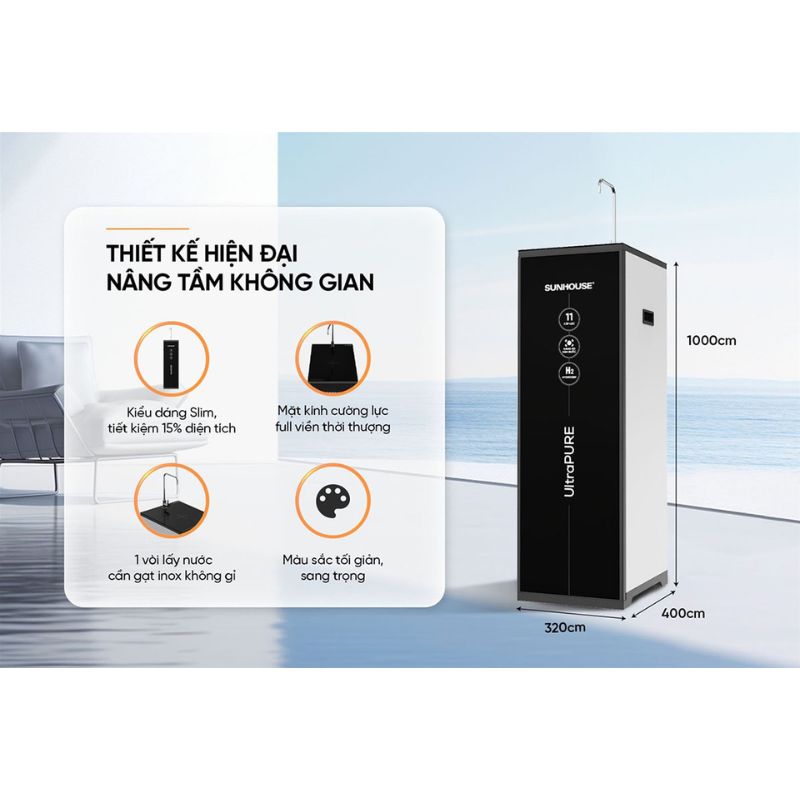 - Máy lọc nước RO UltraPURE Sunhouse SHA8820KL là sản phẩm của thương hiệu Sunhouse, sản xuất tại Việt Nam. Máy có thiết kế kiểu tủ đứng hiện đại hợp với mọi không gian. Kiểu dáng Slim gọn gàng, kích thước 32 x 40 x 100cm (Ngang x Cao x Sâu) và trọng lượng 25kg giúp tiết kiệm hơn 15% diện tích lắp đặt.