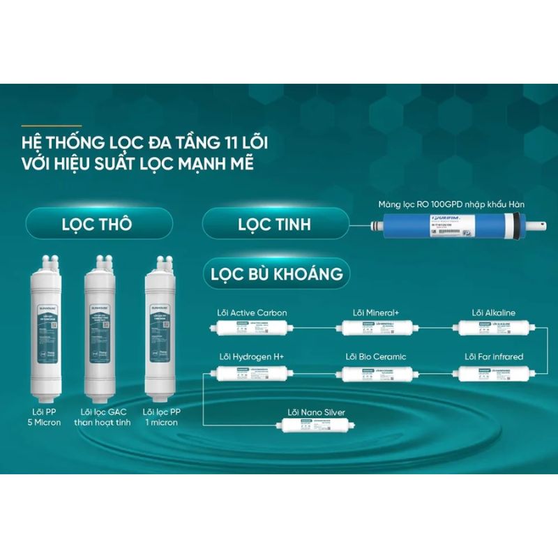 Sản phẩm được trang bị 11 lõi lọc (Chia làm 3 cấp lọc: Lọc thô, lọc tinh, lọc bù khoáng) đột phá với khả năng lọc nước sạch vượt trội, bổ sung thêm một số khoáng chất có lợi cho sức khỏe. Các cấp lọc bao gồm: