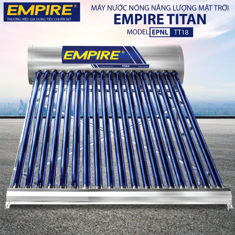 - Máy nước nóng năng lượng mặt trời Empire Titan EPNL-TT-1818 180 Lít được sản xuất theo công nghệ tiêu chuẩn Mỹ, đảm bảo chất lượng và độ bền vượt trội. Máy nước nóng có thể đáp ứng tốt nhu cầu sử dụng nước nóng hàng ngày của các gia đình mà không tiêu hao nhiều điện năng.