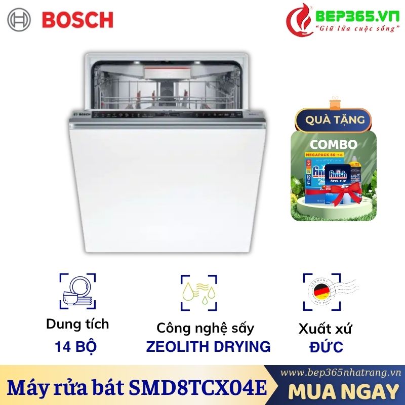 - Rửa được lượng chén bát tương đương 3 – 4 bữa ăn gia đình Việt: Sức chứa của máy rửa chén Bosch SMD8TCX04E khoảng 14 bộ chén dĩa châu Âu, dễ dàng rửa sạch từ chén dĩa đến muỗng đũa, ly tách trong 1 lần dùng với cách sắp xếp hợp lý, giúp chén bát của bạn sạch hiệu quả, nhanh chóng, không tốn thời gian và công sức như cách rửa truyền thống.