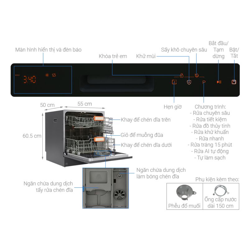 - Tự làm sạch máy – vệ sinh khoang rửa, tăng tuổi thọ thiết bị.