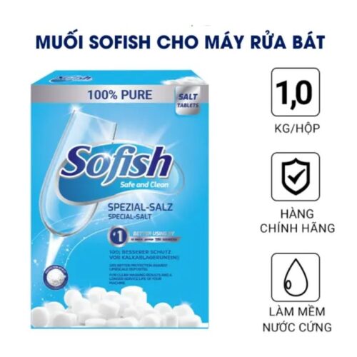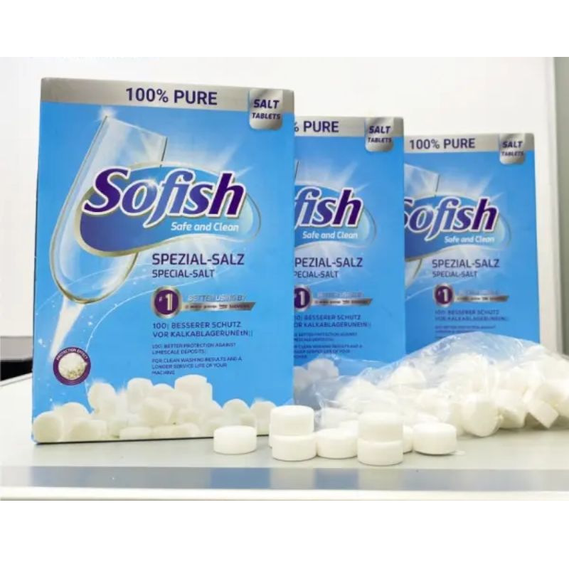 Muối rửa bát Sofish Tablets 1kg là hợp chất muối chuyên dụng được sấy khô bằng máy sấy cao tần 95% cùng chất trung hòa ASMT và các thành phần hóa học khác, giúp làm mềm nước, khử nước cứng có chứa ion Ca+, Fe+, Mg+ có trong nước gây ra vôi hóa, làm hư hại cho bát đĩa và các đồ dùng khi rửa bằng máy rửa bát ở nhiệt độ cao.
