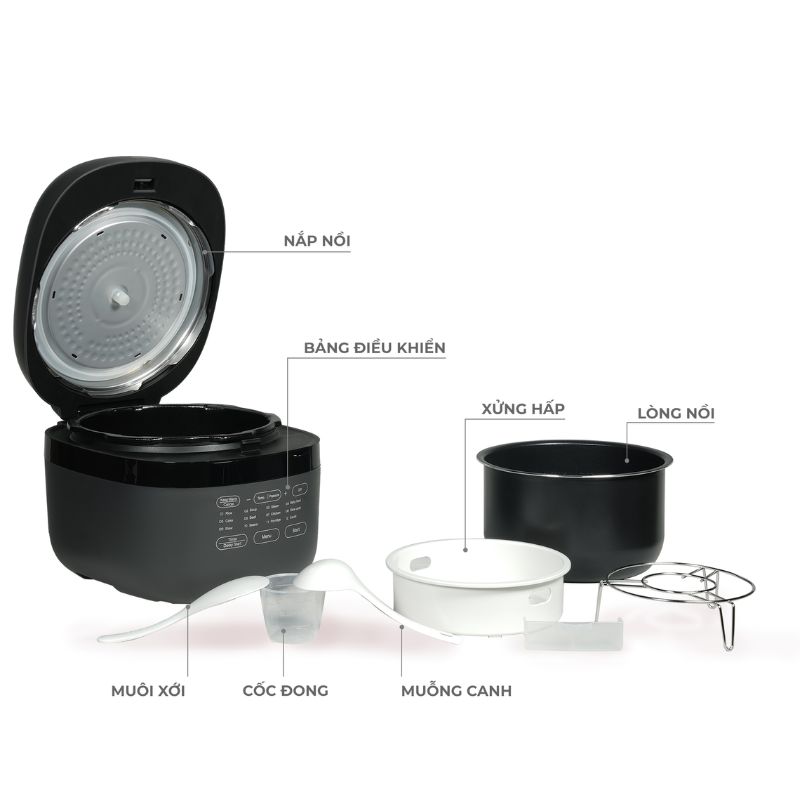 Phụ kiện đi kèm | Thìa xúc, muôi múc, cốc đong, khay hấp, giá hấp, dây nguồn |