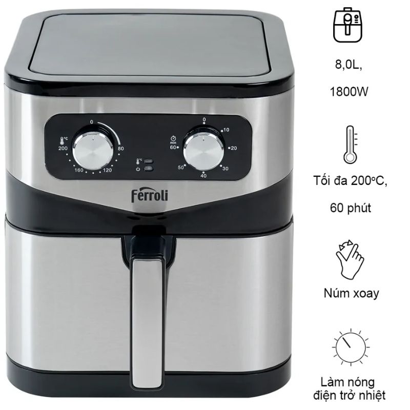 Nồi Chiên Không Dầu Ferroli FAF-8.0M 8 Lít – Công suất 1800W, dung tích 8L, công nghệ làm nóng điện trở nhiệt giúp thực phẩm chín nhanh, giòn ngon mà không cần dầu mỡ.