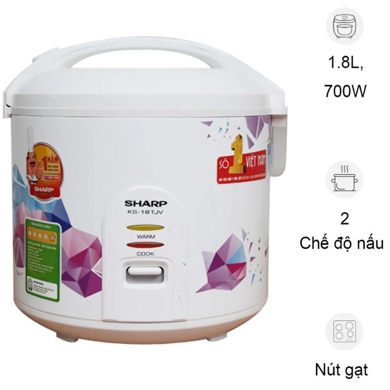 - Chế độ nấu và giữ ấm tiện lợi: Với hai chế độ chính là nấu và giữ ấm, nồi cơm điện Sharp KS-18TJV đảm bảo cơm luôn nóng hổi sẵn sàng để phục vụ gia đình bất cứ lúc nào. Chế độ giữ ấm giúp cơm luôn mềm, thơm ngon mà không bị khô cứng.