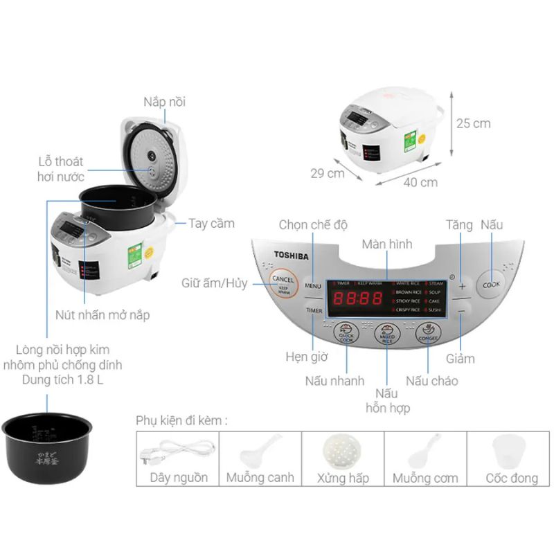 - Chế độ nấu: Súp, Nấu nhanh, Làm bánh, Hấp, Gạo trắng, Gạo nếp, Gạo lứt, Giữ ấm, Cơm trộn, Cơm sushi, Cơm cháy, Cháo