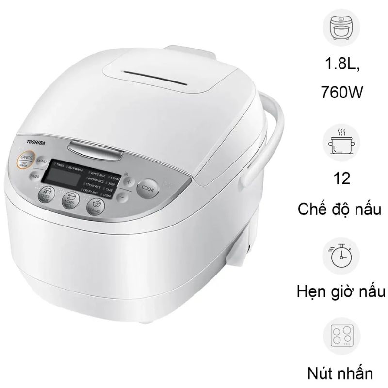 Nồi cơm điện Toshiba RC-18DH2PV(W) 1.8 lít với thiết kế hiện đại, chất liệu bền bỉ và khả năng nấu cơm chín đều, giữ ấm tốt, là sự lựa chọn lý tưởng cho gia đình bạn.