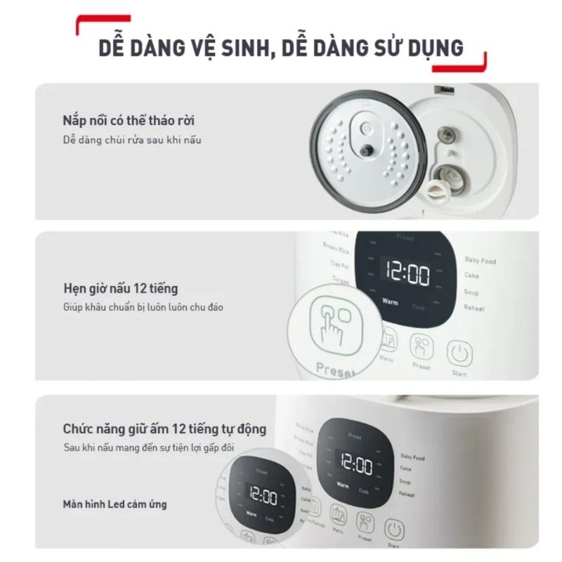 - Chức năng giữ ấm lên đến 12 tiếng: Bạn có thể giữ cơm ấm lâu mà không lo cơm bị nguội hay khô, giúp bạn tiết kiệm thời gian cho bữa ăn.