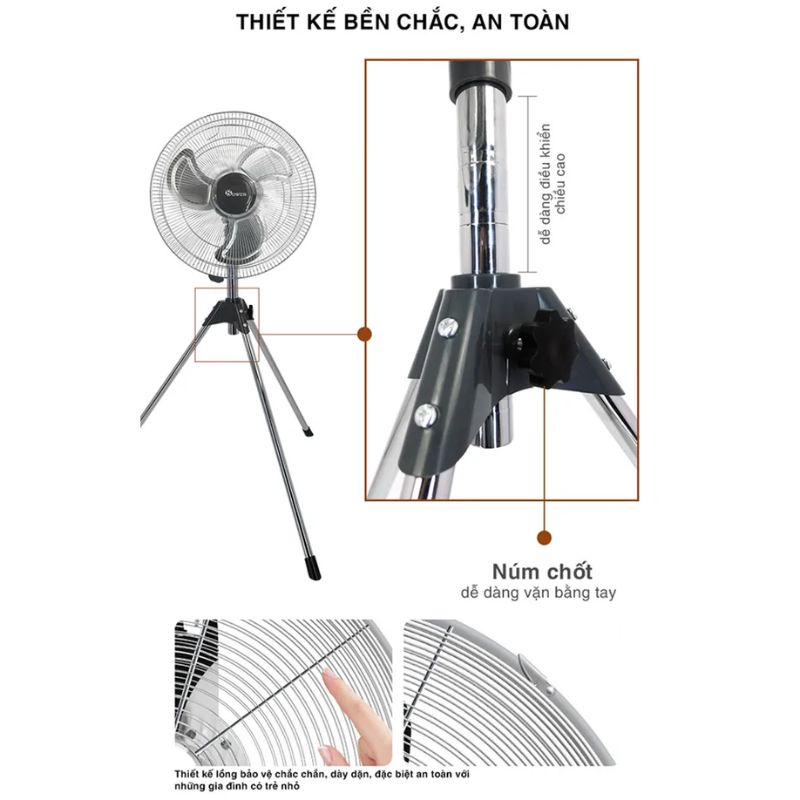 Chất liệu | – Cánh quạt: Nhôm – Thân quạt: Kim loại cứng cáp dạng rút – Mô tơ bằng 100% dây đồng |