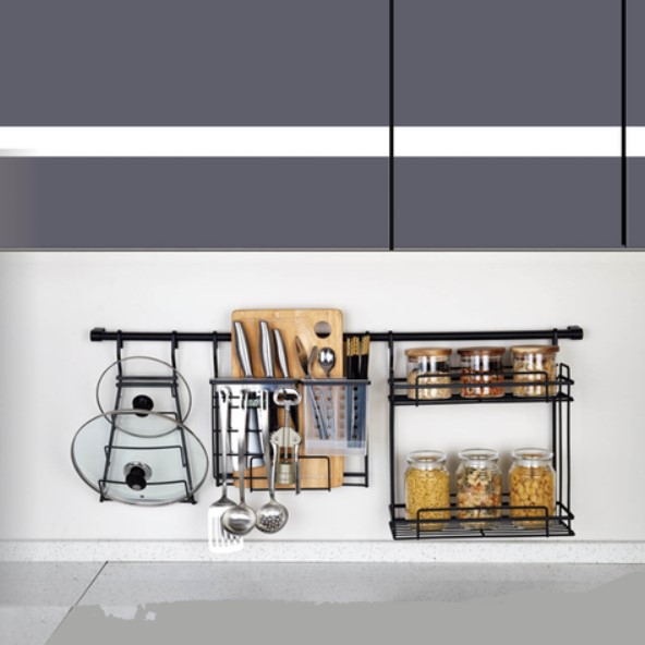 - Bao gồm: thanh suốt, bas gắn tường, 1 giá treo vung, 1 giá treo dao thớt ống đũa dụng cụ, 1 giá để chai lọ gia vị 2 tầng