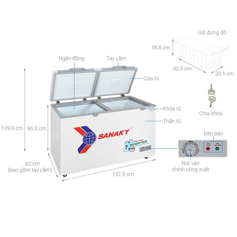 - Thiết kế tiện dụng, dung tích lớn: Tủ đông Sanaky VH4099A4K có thiết kế 2 cửa mở trên tiện lợi, dung tích sử dụng 305 lít phù hợp cho gia đình, cửa hàng hay nhà hàng nhỏ.