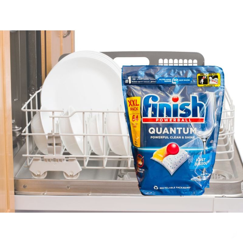 - Finish Quantum All In 1 túi 64 viên hương chanh có Tinh chất hương nước hoa chanh giúp đánh bay mọi mùi khó chịu từ thức ăn thừa và mang tới thơm dịu tự nhiên cho bát đĩa sau khi rửa.
