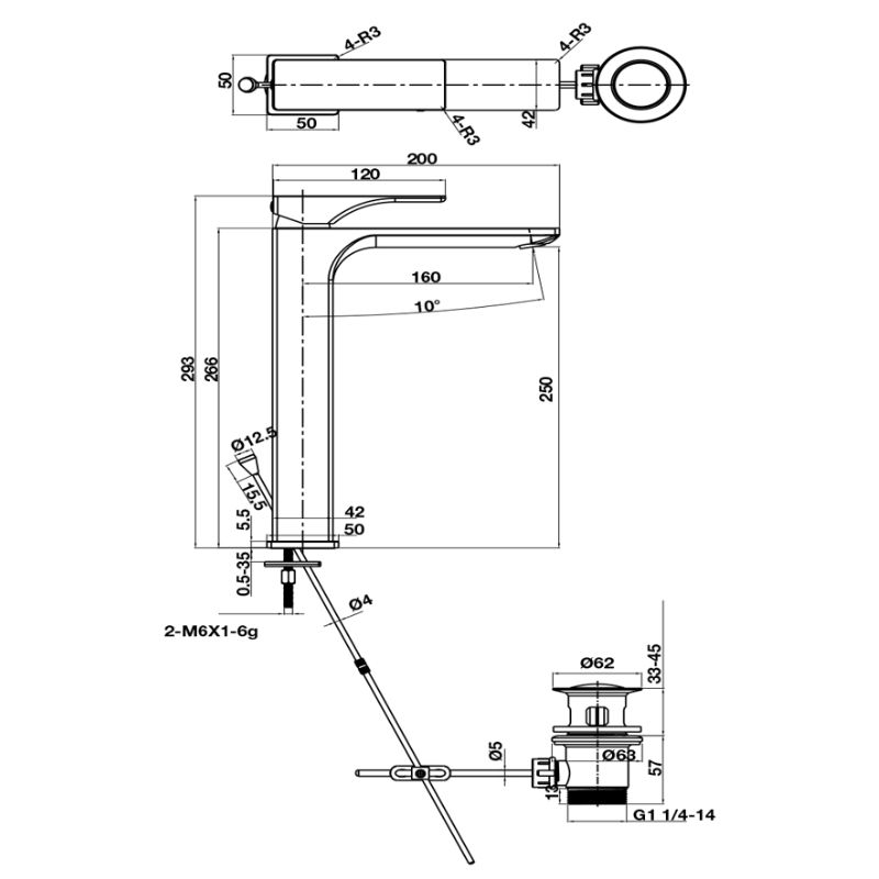 - Khoảng cách từ đầu vòi đến mặt bàn: 250mm